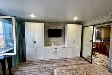 На первом этаже расположены большая гостиная-кухня, спальня, санузел.