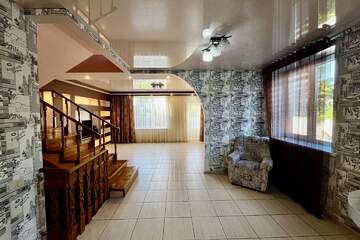 На первом этаже расположен большой холл с выделенными зонами кухни и столовой, небольшой санузел.